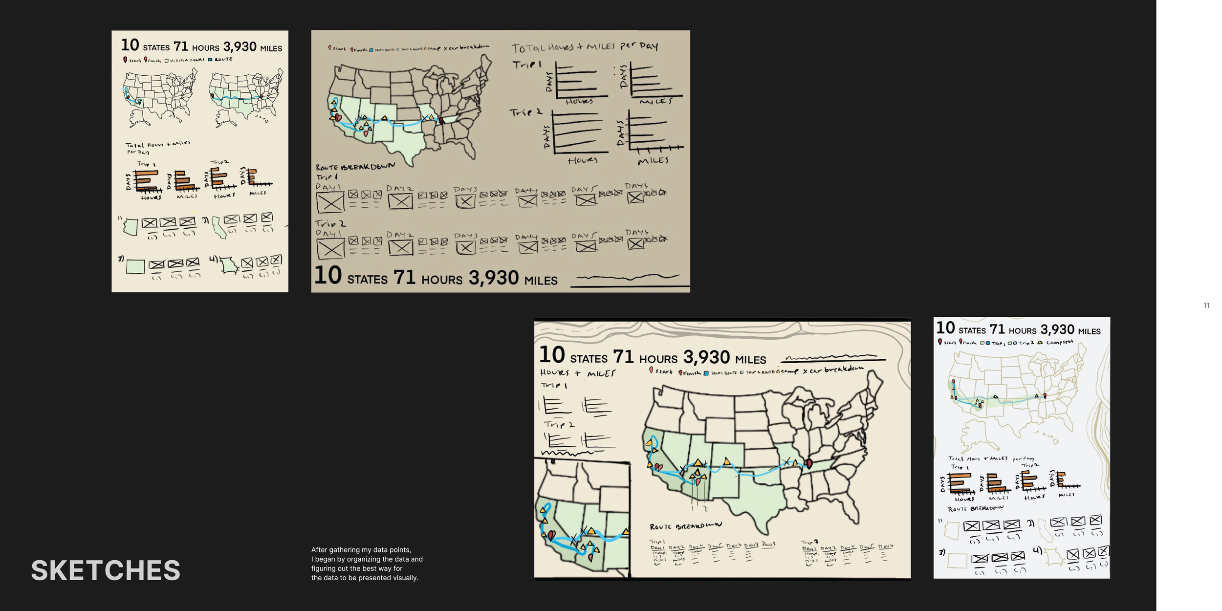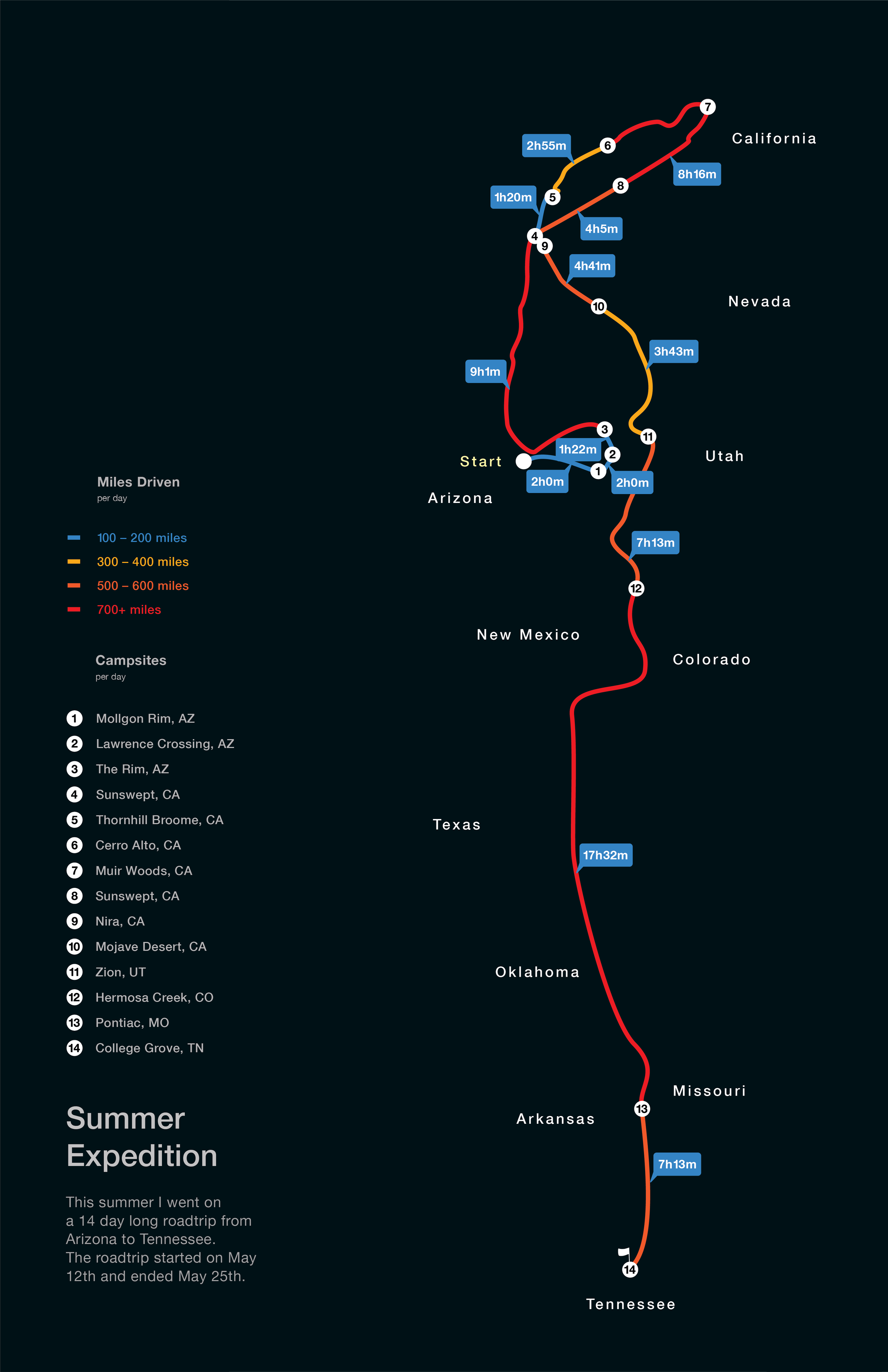 A poster design for the number of hours driven during a summer road trip. In this design, I focused on simplifying the data without losing too much of the information.